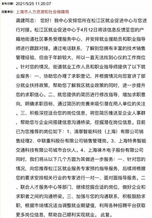果不其然,上海市民郵箱(上海人力資源和社會保障局)很快給了他幫助,實際上都給他推薦了4個工作讓他選了。他已經得到了回報。