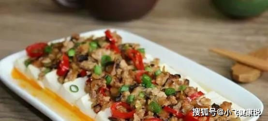 3.買回的豆腐先用鹽水浸泡,撈出控干水後切片碼在盤子裡備用