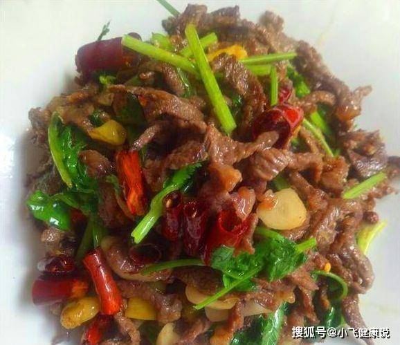 2.油鍋熱後,倒入醃好的牛肉絲,翻炒,知道牛肉顏色都變成熟的顏色;
