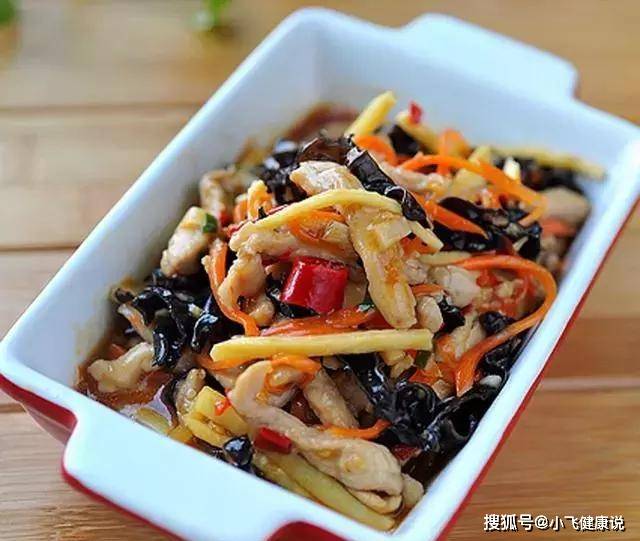 4. 鍋燒熱放入油,低油溫時倒入肉絲大火煸炒到肉絲表面變色裝盤備用,鍋中余油爆香姜、蒜末,放入剁椒一起爆香,放入冬筍絲、胡蘿卜絲、黑木耳絲轉大火翻炒,然後放入肉絲翻炒均勻。
