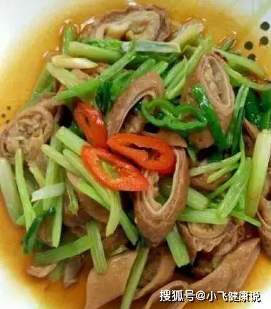 食材:鹵豬腸300g;芹菜250g;蒜少許;姜少許;蒜葉兩根;青紅椒少許;鹽少許;生抽少許;食用油少許