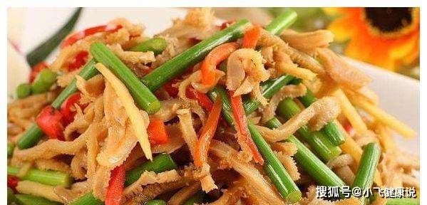 1、處理好的羊肚切細絲,青紅辣椒切同樣的絲,蒜苔切段鍋中放油,放入姜蒜片爆香,倒入羊肚絲大火爆炒;