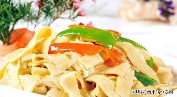 食材:青椒,豆腐皮,鹽,澱粉,味精,醬油,食用油