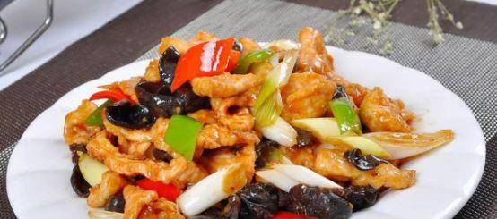 6.鍋中留油10克,燒熱下入蔥姜蒜、洋蔥、青椒、木耳、肉片煸炒拌勻。