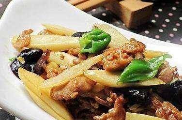 ]食材:山藥300g、香菇8朵、裡脊肉200g、青椒1個、油、蔥、鹽、白糖、料酒、生抽、澱粉、雞精、香油、姜。