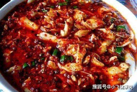 6.烹入料酒去腥煮開1分鍾(肉片比較薄,煮熟即可);肉片撈出放到菜的上面,放入紅油辣椒,頂部放上辣椒丁;另起鍋,涼油加入剩下的花椒、麻椒小火炸至變色;趁熱澆在辣椒碎上即可;