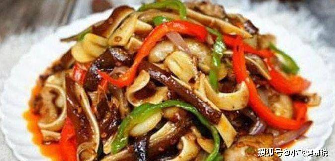 3.放入豬耳朵煸炒5分鍾左右,感覺豬耳朵開始外層變的黏黏的時候到少許醬油並加入切好的尖椒和柿子椒繼續翻炒。