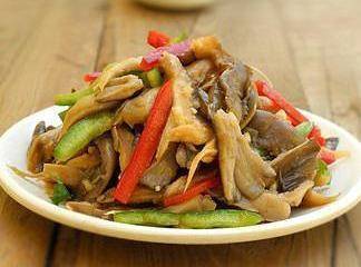 食材:平菇、青紅椒、水、蔥、姜、糖、鹽、醋、生抽、香油