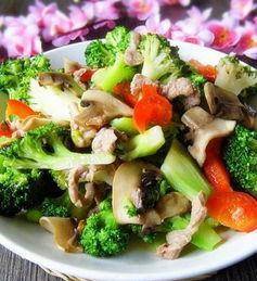 食材:西蘭花,口蘑,肉絲,花生油,大蔥,鹽,大蒜,蚝油