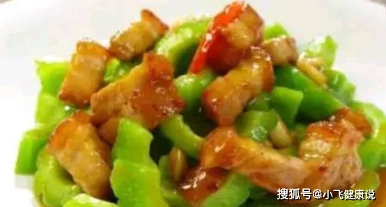 6、2分鍾後加入苦瓜一塊翻炒,加入肉片繼續翻炒
