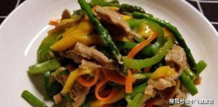 食材:豬肉絲、芒果、蘆筍、青椒、胡蘿卜、雞蛋、鹽、雞精、耗油、生抽、料酒、白糖