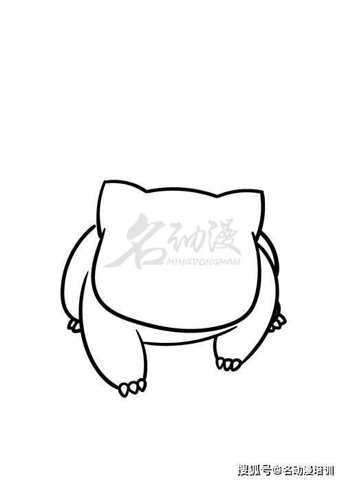 第二步:妙蛙種子四肢著地行走,看起來是一隻可愛的爬行動物,我們現在臉部地下畫出妙蛙種子的小肚子,然後再畫出兩只前腿,在前腿末端添加三個小的尖爪,最後在靠近耳朵附近畫出兩只後腿,同樣記得在腿部的末端畫小小的尖爪。