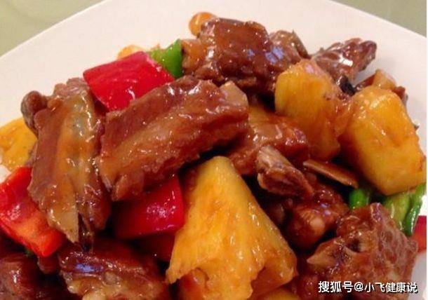 材料: 脆骨排300克、菠蘿一個、青紅彩椒各半個、蔥、姜、蒜、桂皮一小塊、八角一個、料酒、生抽一匙、番茄醬兩大匙、鹽、冰糖;