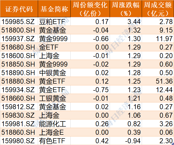 商品ETF本周除有色ETF下跌0.94%外,其餘均實現上漲,豆粕ETF大漲3.44%,而黃金相關ETF普遍漲逾1%。