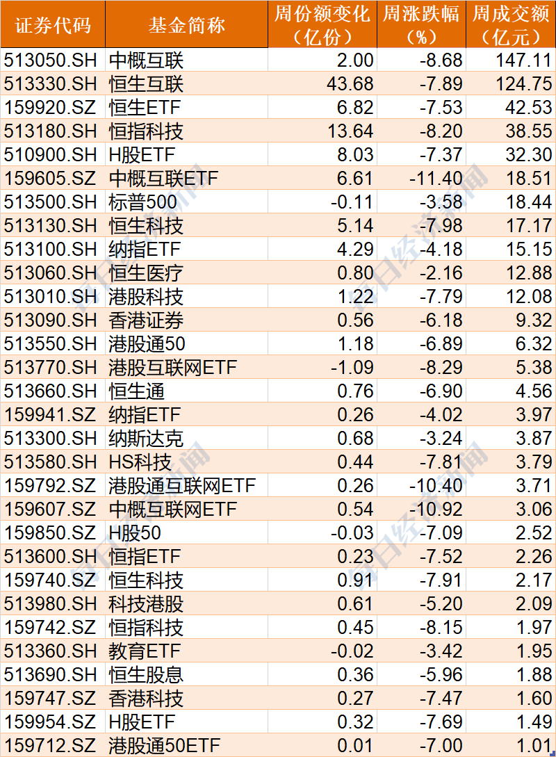 跨境ETF本周成交額超過1億元的有30隻,普遍出現調整,其中中概互聯ETF、中概網際網路ETF和港股通網際網路ETF分別下跌了11.4%、10.92%和10.4%;份額上,恆生互聯增加了43億份。