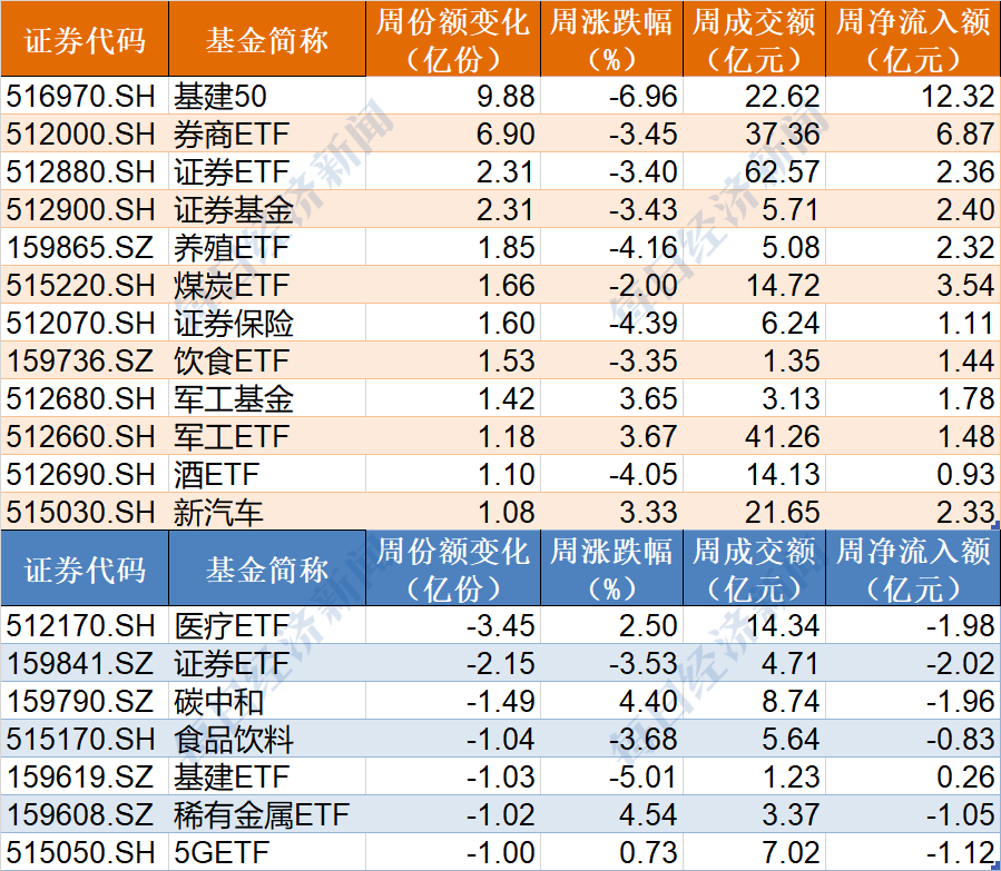 值得注意的是,本周跌幅較大的基建和證券相關ETF獲得了資金大幅抄底,而連漲2周的醫療ETF,持續被資金拋售。