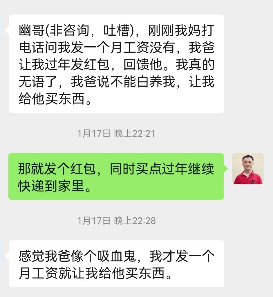 上圖這位本科女孩,畢業後考公耽擱了下,這才拿了1個月工資,家裡就來要錢了。過年不想回老家?沒問題,錢和物要到位。