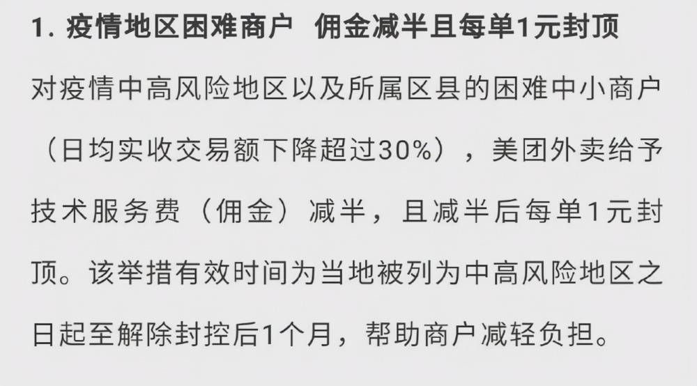 首先來看商家的規則調整。根據美團表示,從今年3月到12月,對中高風險地區的商家實行技術服務費(傭金)減半,減半後每單1元封頂。對已實行費率透明化的困難商戶,結合經營情況最高收取5%的技術服務費。