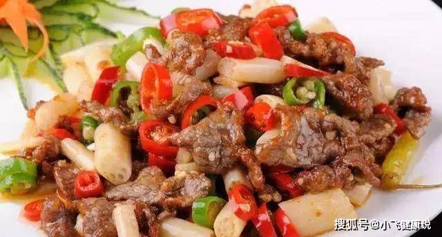 材料:裡脊牛肉250g,小藕100g,紅椒2個,青椒1個,泡椒5個,小粉1茶勺,鹽適量,香油1茶勺,醬油2茶勺,油,大蒜