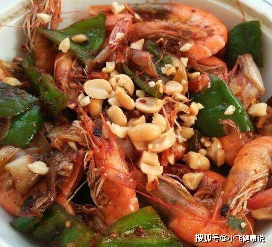 2.另起一隻鍋,再次放油燒熱 ,下入花椒、干紅辣椒煸出香味後倒入先前炸好的蝦和花生翻拌均勻就可以了;