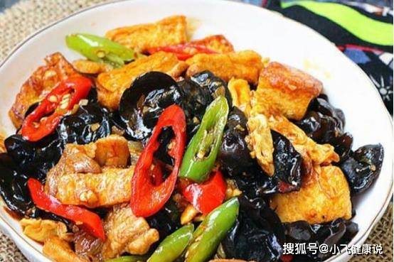 食材:豆腐400克,五花肉100克,雞蛋2個,木耳10克,杭椒3個,美人椒2個,豆瓣醬1茶匙,白糖少許,生抽、食鹽、老抽、蔥、姜各適量