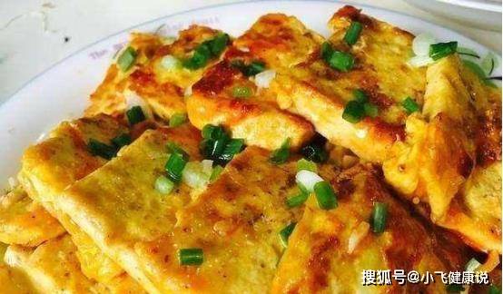 2、鍋內入油燒熱,小火將豆腐煎成兩片金黃色撈出待用