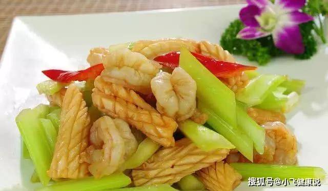 2.西芹切片,過開水焯燙至變半透明,撈出過涼開水