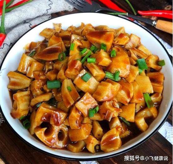 4.炒鍋中加入油,燒熱後倒入藕丁大火翻炒,然後倒入調好的醬汁上色,最後淋上水澱粉,大火翻炒收汁,出鍋前撒上蔥花,搞定!