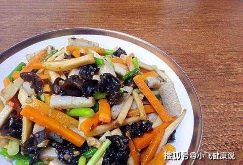 食材:杏鮑菇一個;藕;胡蘿卜;黑木耳;蒜苔主要食材分量依次遞減;薑末適量;蒜末較多(依據個人口味);醬油適量;花椒適量;鹽巴適量;植物油適量