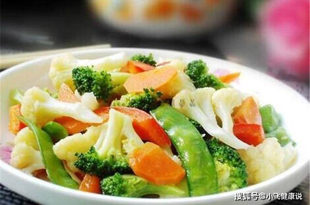 食材:西蘭花、菜花、胡蘿卜、彩椒、荷蘭豆、蒜片、白砂糖、水澱粉、鹽、油。