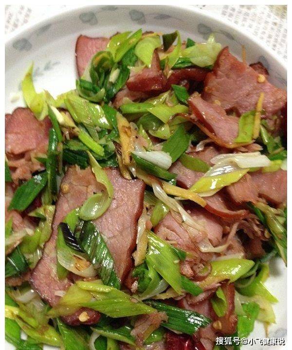 2.把臘肉切成薄片,蒜苗斜刀切寸段,青椒去蒂切成菱形小塊。