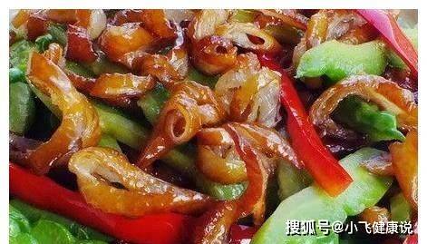 1、香鹵豬耳200克切條,苦瓜150克洗淨去瓤後切成3 厘米長、小指粗的條,鮮紅椒10克切條。