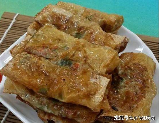 7.不粘鍋下油,油熱,放入腐皮卷煎至腐皮卷,要用小火慢慢煎至兩面微黃即好。