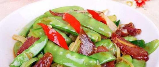 7.炒至臘肉出油,肥肉變透明時入荷蘭豆翻炒。