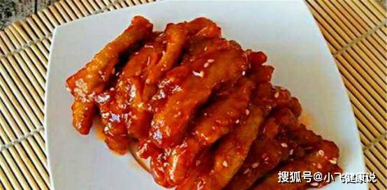 5、鍋里留少許油燒熱,倒入糖醋汁,攪拌濃稠時放入肉條,灑上白芝麻,迅速翻炒至每一條肉都裹上糖醋汁即可出鍋。