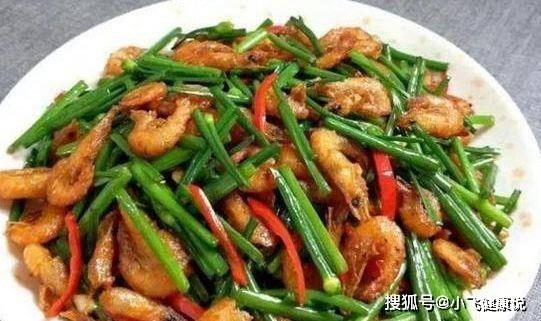 5、鍋內留底油,下薑末、蒜末小火炒香;下韭菜段、紅椒段大火翻炒幾下,加入炸過的河蝦炒均勻;最後調入生抽、鹽、雞精炒入味。