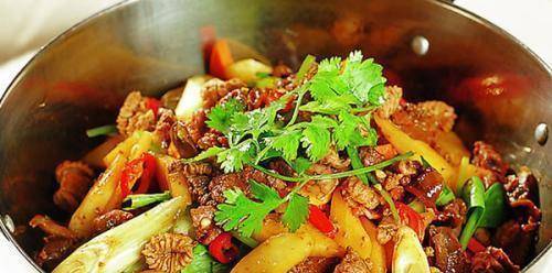 6、再放入雞腿肉一起炒,烹入另一半料酒,炒入味。
