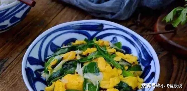2.熱鍋熱油放入蛋液,等蛋液稍作凝固用筷子快速打散至完全凝固,存出備用。熱鍋熱油放入蒜葉,翻炒變軟加入鹽,繼續翻炒均勻。
