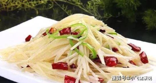1.土豆洗淨,先在底部切一刀,修理平整後,平放在菜板上,先切成片,後切絲。准備一盆清水,滴入少許醋,將土豆絲放入浸泡一會,然後用清水沖洗,瀝干。
