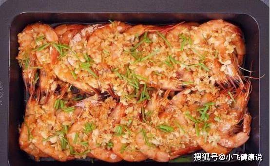 2、大蒜炒香,多放點鹽,出鍋備用。烤盤刷油,把蝦子碼好。