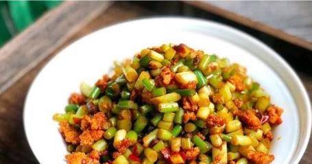 食材:蒜薹、肉末、豆瓣醬、辣豆豉、生抽、糖、五花肉、料酒、薑片