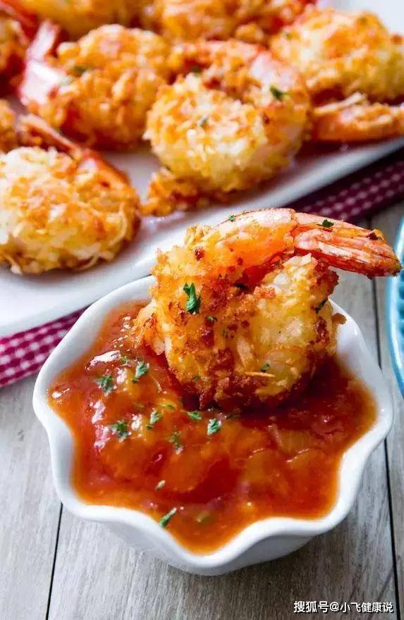 2、將蝦一個一個浸到麵粉里,拿出再浸在雞蛋液里,再拿出浸在麵包糠和椰絲中,然後取出放在盤中備用。