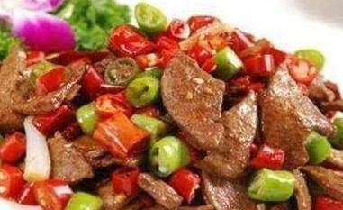 3、鍋中留底油,放入干辣椒,青椒,花椒爆出香味;放入豬肝、鹽、生抽、雞精快速翻炒均勻出鍋即可。