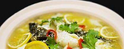 食材:烏魚片、墊底料:酸蘿卜、寬粉條、調味酸菜、鍋底料:高湯、酸菜魚醬、酸味汁、原味檸檬汁、萬能調味粉、白糖、化雞油。色拉油、青蒜苗、紅花椒、整個干小米椒、檸檬。