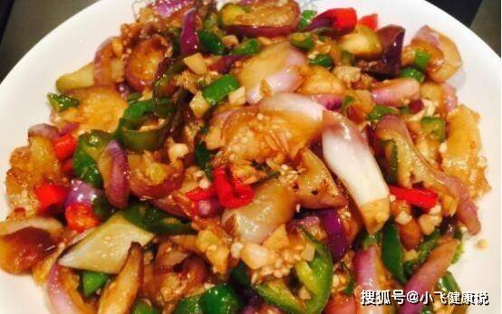2、把茄子放在盤子裡,把青椒和小米椒顆粒蓋在茄子上,