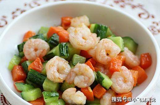 食材:蝦仁 300克、黃瓜 1根、胡蘿卜 1根、澱粉 1/2湯匙、色拉油 適量、食鹽 1/2茶匙、料酒 1湯匙、白胡椒粉 1/2茶匙、香油 1茶、姜 1小塊。