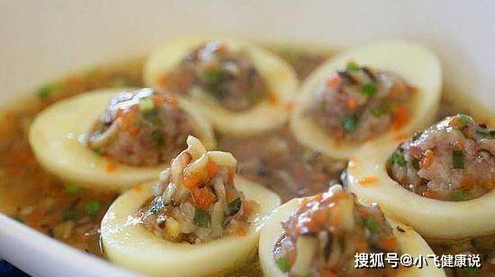 1、雞蛋洗淨,入冷水鍋煮熟。撈出去殼切兩半,取出蛋黃,留蛋白備用;豬肉餡加入鹽、蚝油、料酒、蔥末、用勺子攪拌均勻;用勺子挖出部分肉餡團成丸子,釀入雞蛋白內