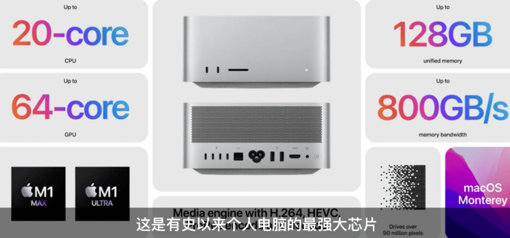 蘋果官方介紹,M1 Ultra是採用了多晶粒架構設計打造,通過將兩顆M1MAX組合成M1 Ultra,擁有極致的算力表現,且對能耗的控制達到了業界領先水準。