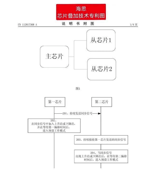 華為海思有這麼一份專利,內容顯示將兩顆晶片疊加成一顆主晶片。主晶片在運行中由晶片1向晶片2傳輸同步信號,通過上升沿或者下降沿,當偏移時間達到設定值時進入預設好的運行模式。