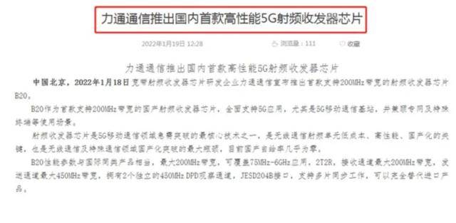 根據力通發布的消息可知,B20 5G射頻晶片可以用在5G等基站上,能夠全面推動5G通信基站實現國產化。